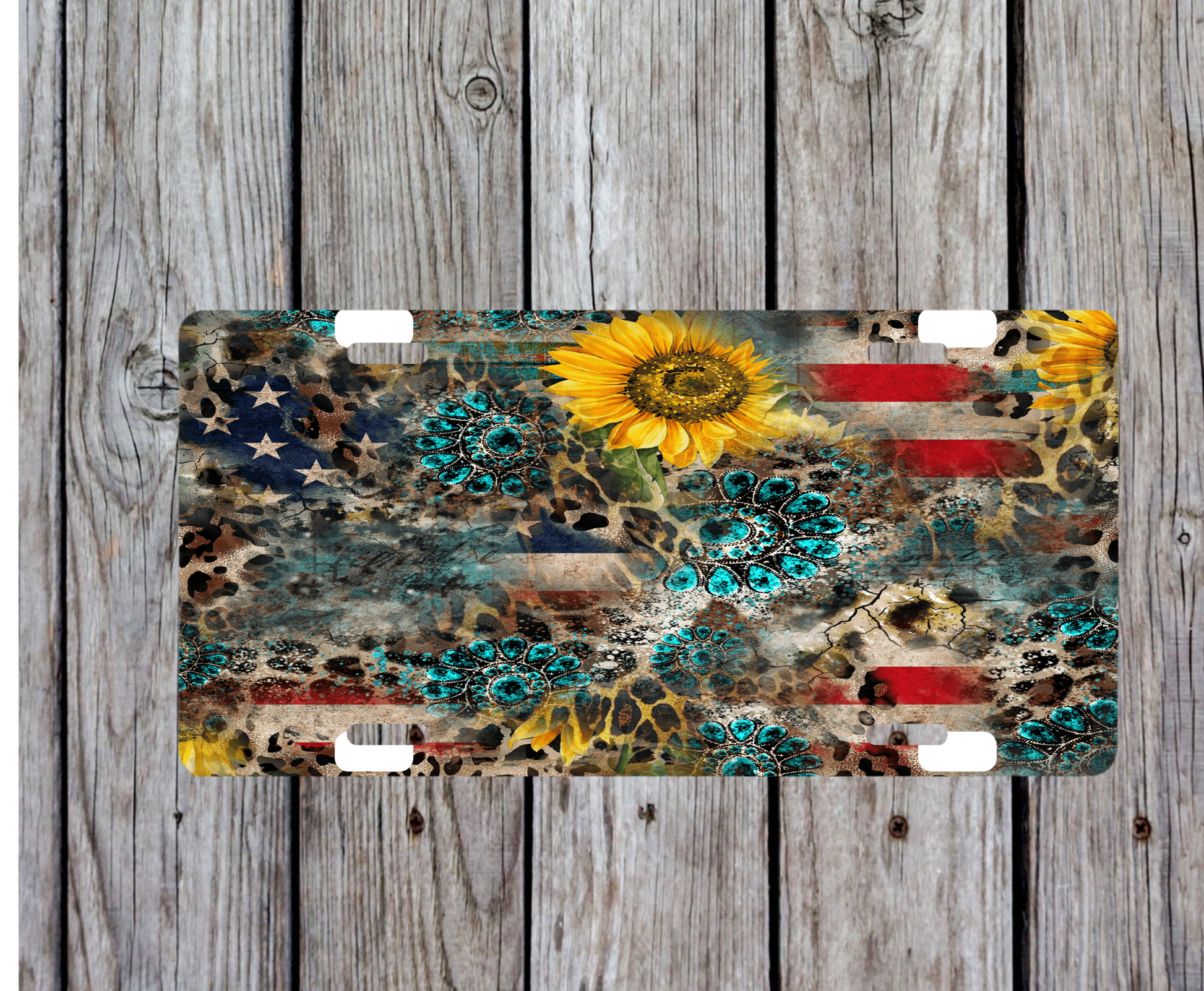 Turquoise, sunflowers, American flag License Plate